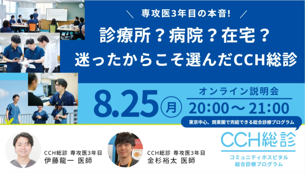 一般社団法人コミュニティ&コミュニティホスピタル協会(C&CH協会)による、関東圏中心の総合診療プログラム『CCH総合診療プログラム(CCH総診) オンライン説明会』 を8/25(月)に開催いたします。