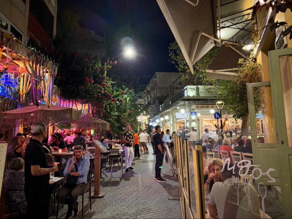 ようやく目的地に到着して駅の外に出ると、暑さが込み上げてきた。9月だというのにアテネは猛暑らしい。ふと振り返ってみると、アクロポリスが丘の上からこちらを見下ろしていた。駅前は商店で賑わい、ここがアテネの中心地の一つであることがすぐに分かった。黄色の街灯が周囲を照らして旧市街を彩る。なんとなくハノイに似た空気があって、安心感が出てきた。言葉以外は大丈夫かもしれない。そう思いながら宿に辿り着いた。