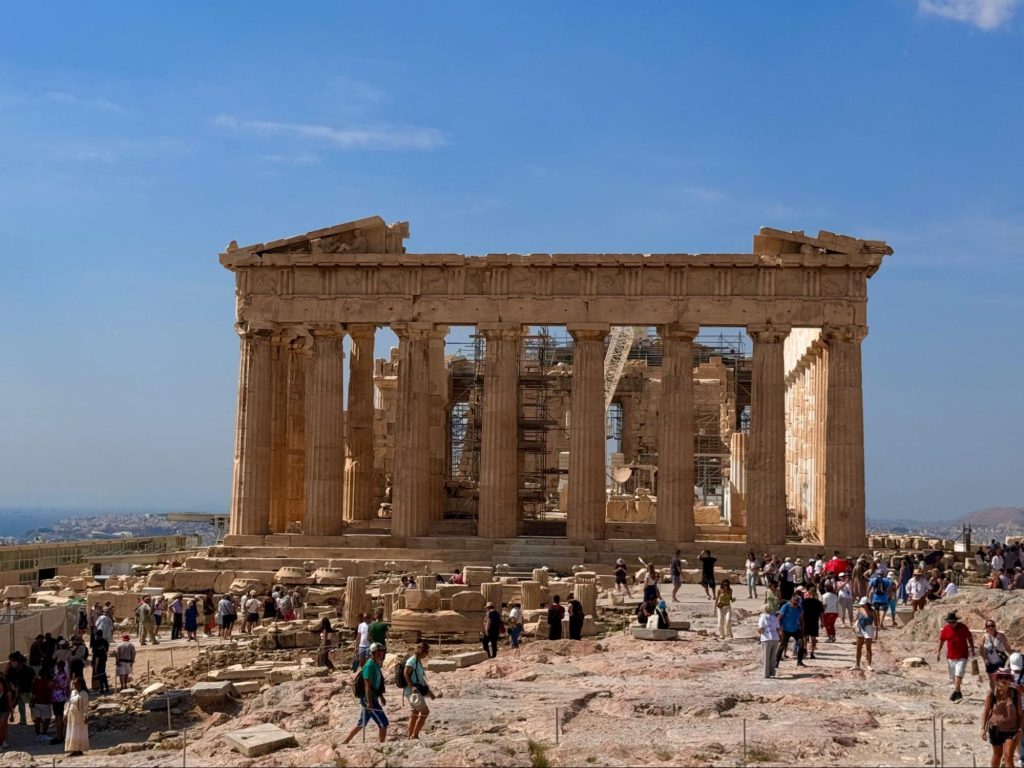 時間が来たのでアクロポリスを観光した。「ポリス」というのは都市国家のことで、神々を祀った神殿がある。実はいろんなところにあるらしいが、アテネのアクロポリスには有名なパルテノン神殿があった。暑い中、丘を登るのは大変なのだが、目の前に観光名所というお宝があると足が勝手に進んだ。たどり着いた神殿は、遠くからは分からなかったが工事中であった。「おい、マジかよ」と思うが、こういう定期的な保全があるからこそ、今こうして見られているのだろうなと感謝の言葉に入れ替わった。