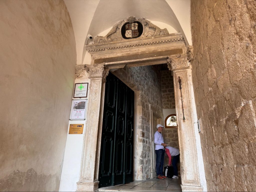 薬局はフランシスコ会修道院の敷地内、旧市街の中心部に位置しており、教会や有名な噴水の真正面にある。門から入ってすぐ薬局に辿り着ける位置は、かつて体調を崩した旅人や巡礼者がすぐに薬を求められるよう考えられたものかもしれない。現代の救急外来がアクセスの良い場所に設置されるのと同じ合理性を感じる。