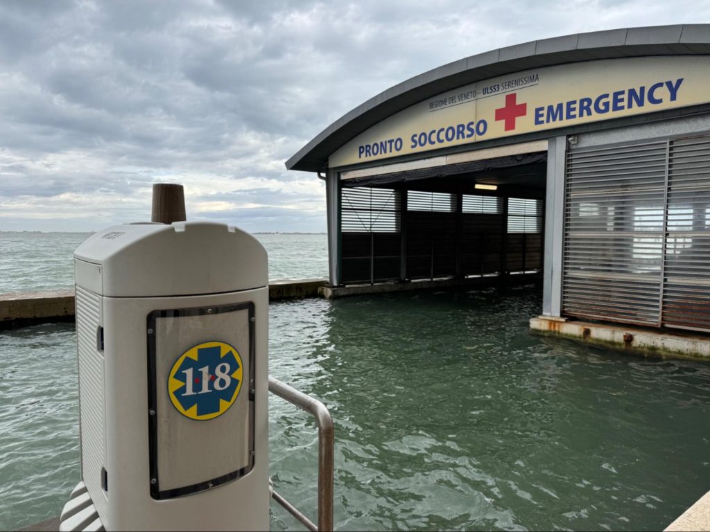 島から戻ってくるとフォンダメンタ・ヌオーヴェという停泊場、本島の北側に着いた。河岸に一隻の救急船が停まっている。その内陸側には救急通路があって建物に繋がっていた。当然その先には病院があるということになる。すこしの不謹慎さを抱えながら、立ち寄ってみることにした。入ってみるとびっくり。そこは病の人が体を癒すというより、元気な人が舞踏会でもしようとせんばかりの場所であった。