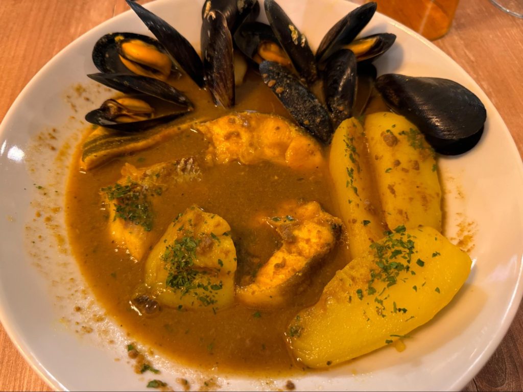 たどり着いたのは港の横にあるローカルなブイヤベース店だ。注文すると魚介とジャガイモが鍋いっぱいに運ばれてくる。旅館で汁物を温める燃料の上に静置され温度を保ったまま食べるようだ。見た目は茶色い。イメージは赤いスープだったのでトマトが少なめなのかもしれない。3組くらいしか入れなさそうな店内では誕生日を祝っている。観光地店というよりは地元に愛される店で「こっちで良かったのでは」と安心させてくれる。